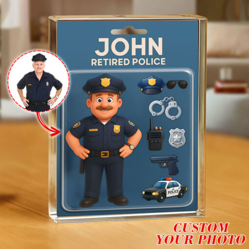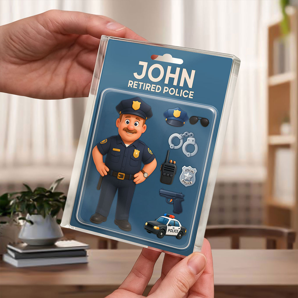 This custom 3D acrylic block plaque turns a loved one into a miniature collectible-style figure — complete with personalized face, name, outfit, and themed accessories.